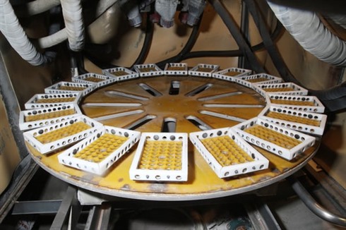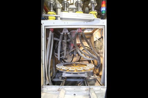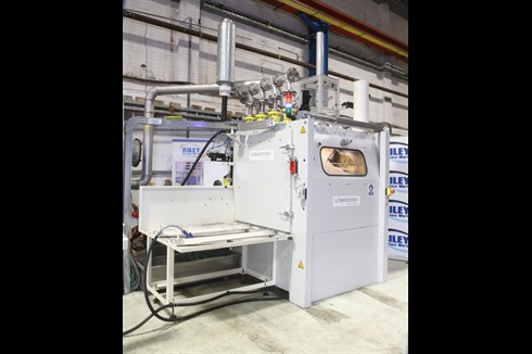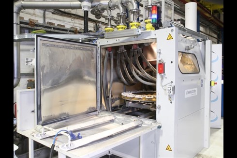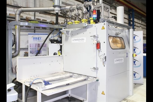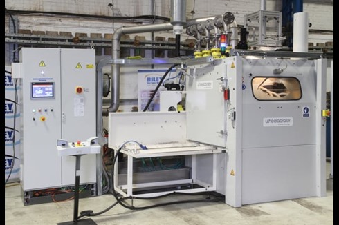 Wheelabrator Vaqua 150AXT semi automatic wet blasting cabinet featuring dust free Airblast technology for batch processes. The Ø1000mm indexing 18-station turntable positions the work under the 6 reciprocation blast guns to achieve full surface coverage.