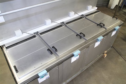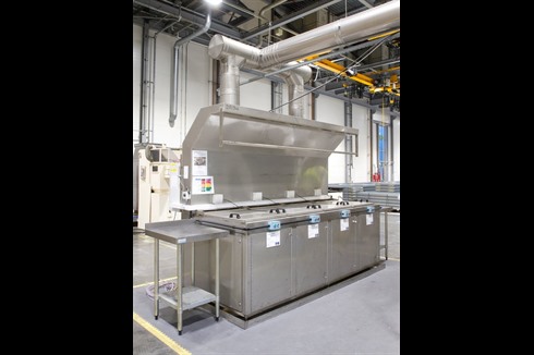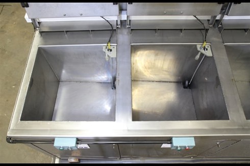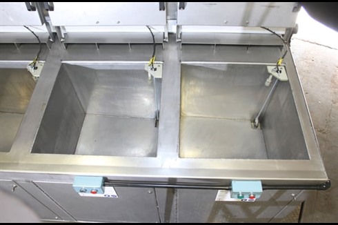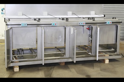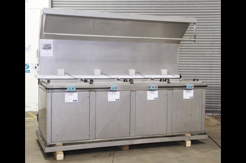 Multi-stage aqueous 4 tank, all stainless steel immersion process cleaning/coating line with integrated twin level extraction ducting control panel.