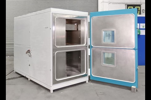 A thermal shock twin chamber testing machine used for verifying the reliability of electronic materials, industrial or pharmaceutical products that are subject to temperature variations.