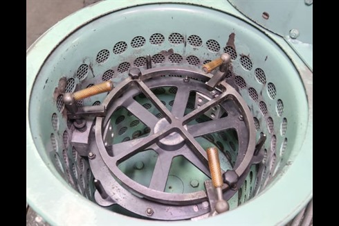 A modern centrifugal parts dryer with a perforated basket housed inside the rotating drum (which spins at 625 rev/min), in conjunction with a base mounted turbine fan pulls air through, therefore speeding up the drying process.