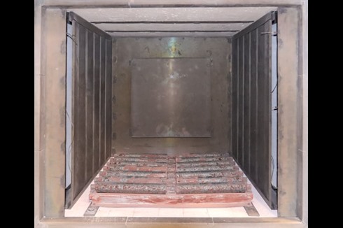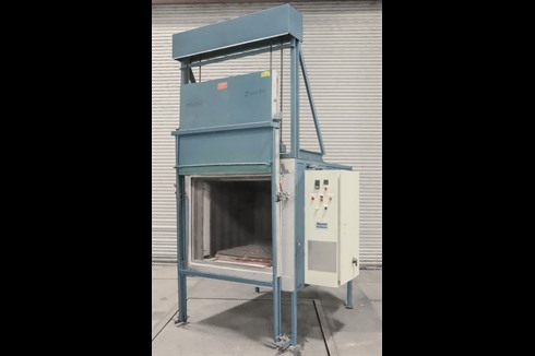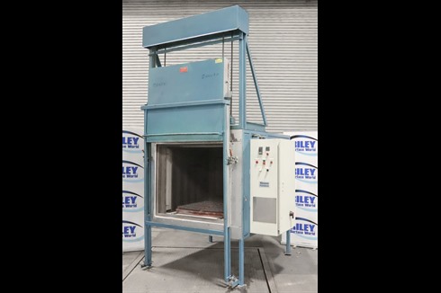 This steel lined, 670°C, roller hearth, industrial, air circulated oven has a large chamber size of 950mm x 1000mm x 950mm. Featuring a vertical lifting door, Eurotherm 3208 PID controller and Eurotherm 3216 over temperature controller.