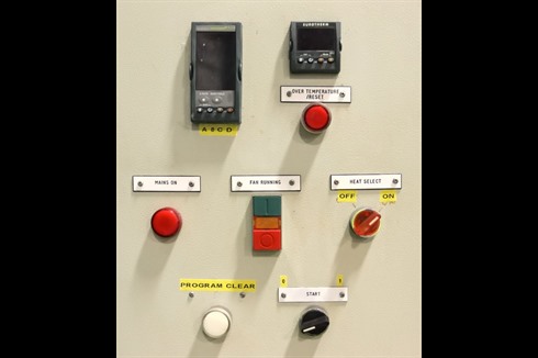 This steel lined, 670°C, roller hearth, industrial, air circulated oven has a large chamber size of 950mm x 1000mm x 950mm. Featuring a vertical lifting door, Eurotherm 3208 PID controller and Eurotherm 3216 over temperature controller.