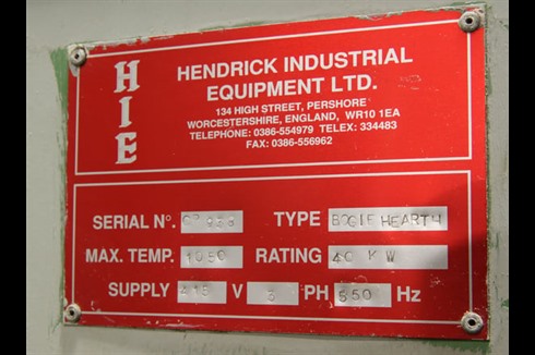 Hendrick Industrial Equipment Ltd Pre-oxidization and Annealing Furnace with 2 rail mounted carts/ bogeys to allow components to be wheeled into and out of chamber. 0-925°C temperature range, switchgear, accessories and spares, rebuilt in 2003.