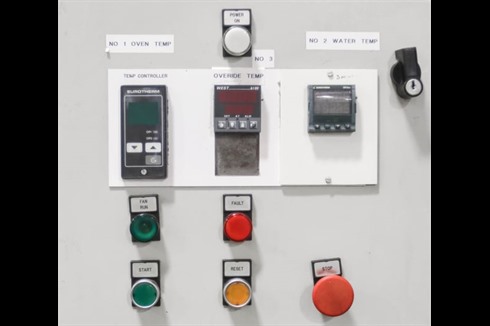 A 2000 Litre, ex NDT line, 150°C drying oven with roller hearth oven chamber and loading/unloading stand. It benefits from air circulation through the chamber with heating elements mounted above the drying chamber.