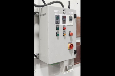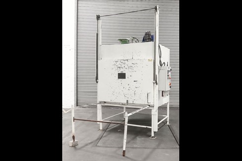 A 2000 Litre, ex NDT line, 150°C drying oven with roller hearth oven chamber and loading/unloading stand. It benefits from air circulation through the chamber with heating elements mounted above the drying chamber.