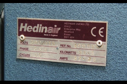 A second hand, very heavy duty, high temperature Hedinairoven, this oven is suitable for all types of production work. Features include an air circulation rear mounted fan and manual chain lift up door for full chamber access. Perfect for covering a wide range of products and heat treatments.