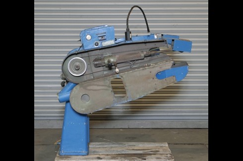 Heavy duty space saving twin belt linishing machine, complete with forward facing adjustable angle arms with guarding and adaptable idling contact wheels.