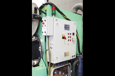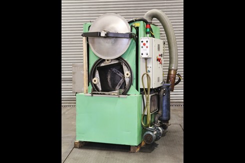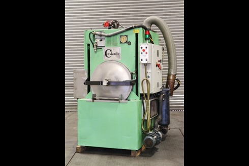 A front loading, aqueous-based industrial parts washing machine. Designed to accept mesh lidded containers filled with components for heated aqueous cleaning. Featuring a rotating drum with flood wash and vacuum drying.