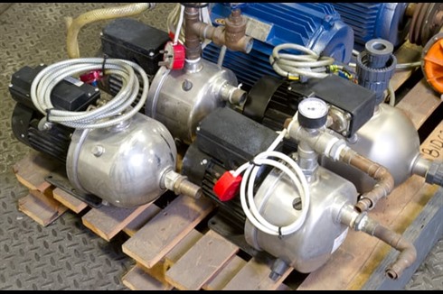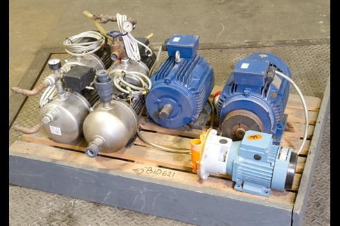 Collection of pumps and Motors. 5 pumps consist of 4 Lowara style stainless steel body pumps and the fifth one is a plastic pump. The two motors consist of a 7.5kW 3 phase unit with a double vee belt pulley mounted to the shaft, the second motor has no pulley but is similar in size
