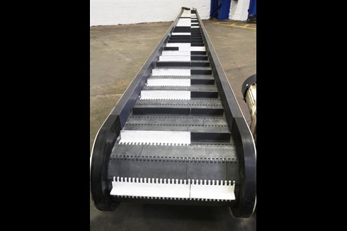 Walther Trowal C6.6/370 modular slatted belt conveyors are an ideal way of conveying products between processes. The modular construction means that individual or custom flights can be inserted allowing the unit to be adapted to suit a wide range of products.