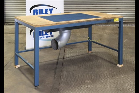 Metal frame fettling table with down draft dust extraction capability. Inset metal grid 840mm x 640mm fitted in a wooden tabletop.